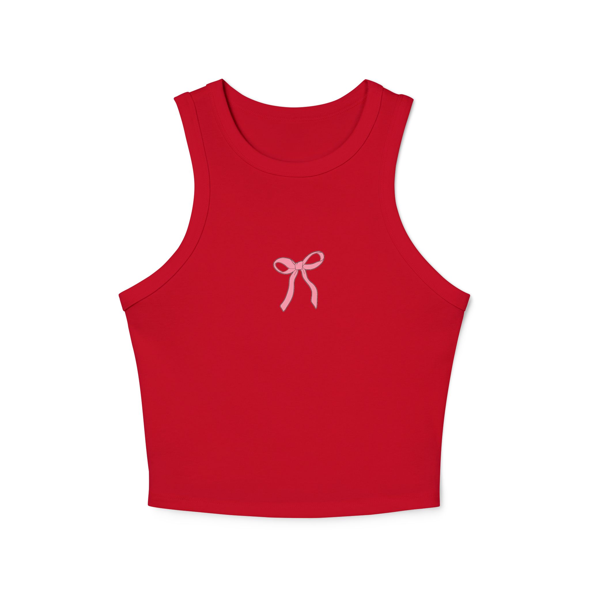 Lightweight and flattering, this micro rib racer tank is a quietly stylish layer that moves with you. The high neckline and mid-length cut give a modern, cropped silhouette that pairs effortlessly with high-waisted jeans, skirts, or layered under an open shirt. The soft Airlume combed cotton blend and subtle 1×1 micro ribbing create comfortable stretch and a refined texture, while the delicate pink bow motif adds a playful, feminine touch without shouting for attention. Breathable and fitted, it becomes a go-to for sunny strolls, café hangs, or low-key nights out — a small detail that elevates everyday outfits and feels like you, just a little bit more put together.